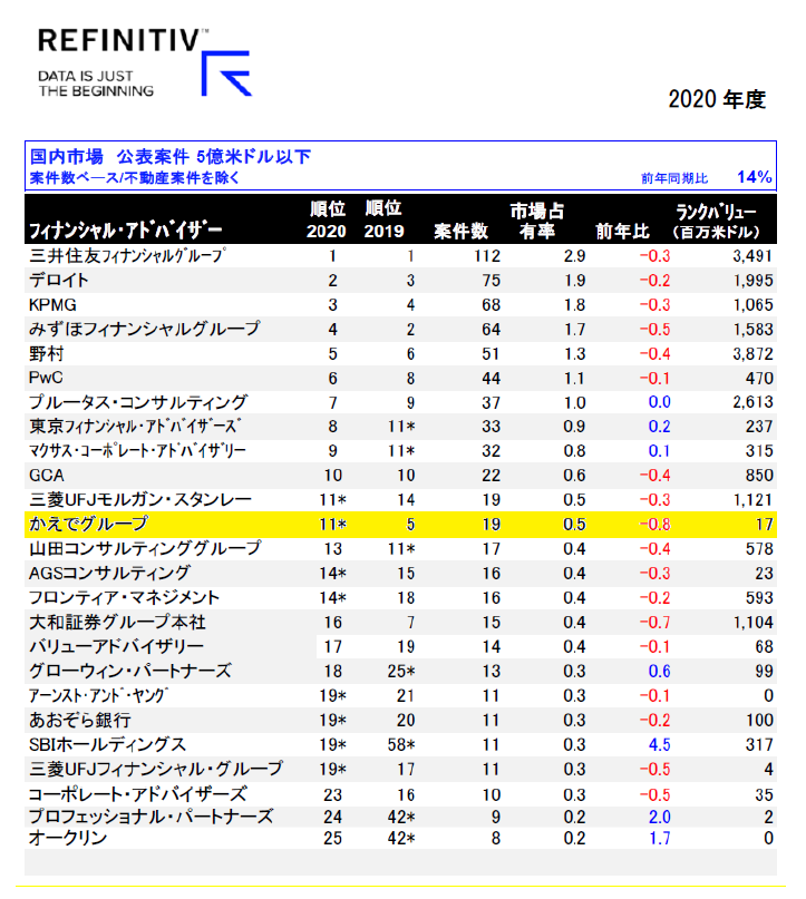 お蔭様で、世界的に有名な情報機関であるREFINITIVが毎年集計しているM&A成約件数のランキングでは9年連続ランクインしています。昨年度は第11位でした。下の表をご参照ください。