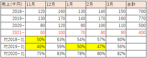 まず、①2018年11月~2019年3月、②2019年11月~2020年3月、③2020年11月~2021年3月の売上をエクセルに記載します。
