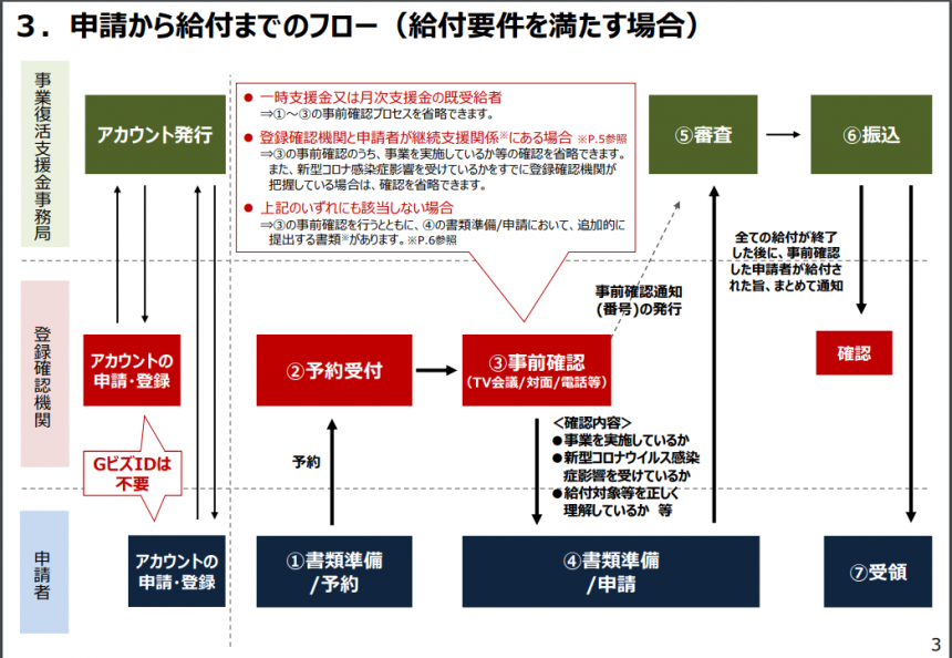 まずは、中小企業庁の事業復活支援金事務局にアカウントを登録し、その後、書類を準備して顧問税理士などの登録確認機関に相談してください。その後の流れは登録機関である税理士などが説明してくれます。