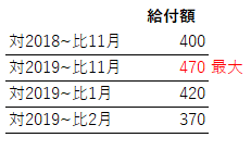 以下の例では対2018年比11月と対2019年比(11月、1月、2月)で要件を満たします。