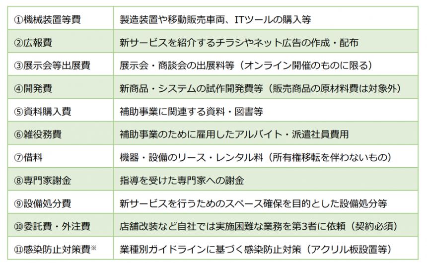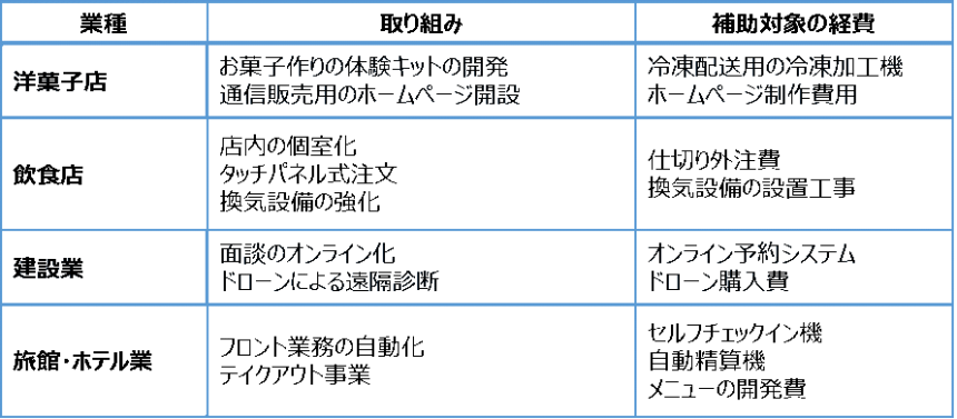 販売促進、商品開発、業務効率化、感染拡大防止などの幅広い取り組みが対象となります。補助対象事業と補助対象経費の例は以下の通りです。